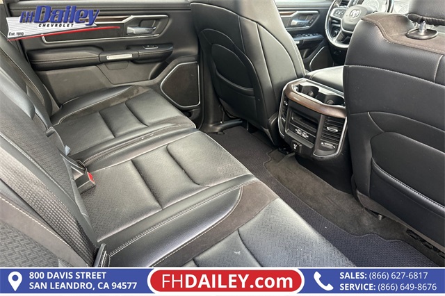 Inside, the Crew Cab configuration provides spacious seating for up to five passengers, with leather-trimmed bucket seats, heated and ventilated front seats, and a power-adjustable drivers seat with memory. The cabin is loaded with tech, including a Uconnect 5 system with a 12-inch touchscreen, Apple CarPlay, Android Auto, navigation, and premium Alpine audio system.