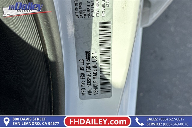 Experience unmatched power and luxury in this 2022 RAM 1500 Laramie Crew Cab 4x4, now available at FH Dailey Chevrolet in San Leandro, CA. This full-size pickup blends bold performance with refined comfort and cutting-edge technology, making it the perfect truck for work, play, and everything in between.